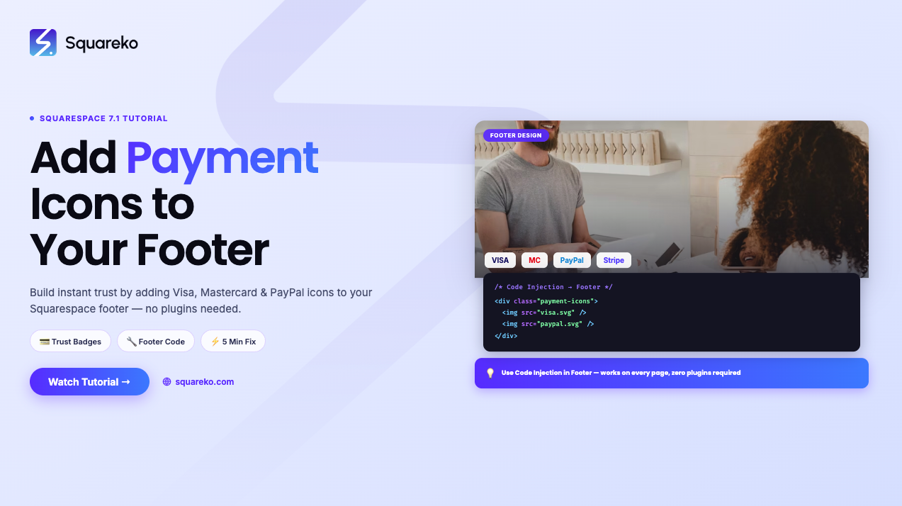 Payment method icons in your Squarespace footer can be a quick, easy, but powerful upgrade. It gives peace of mind, establishes brand professionalism, and builds trust at checkout.