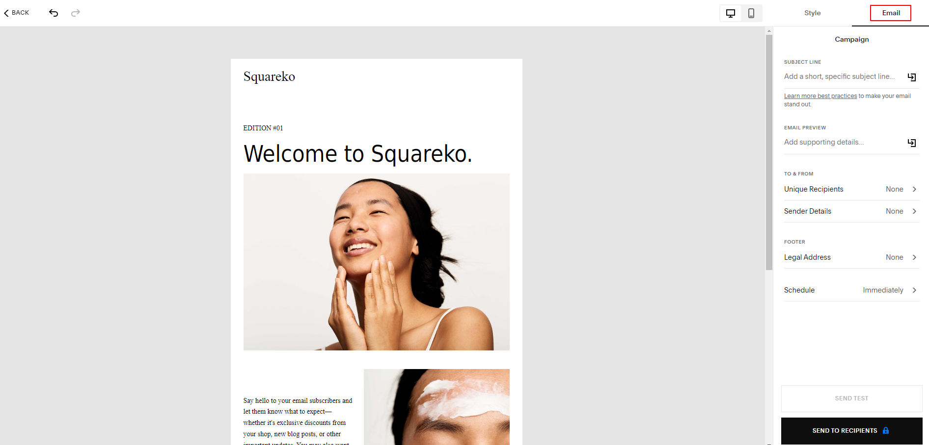 Add images from your Squarespace account to build brand-friendly email templates in Email Campaigns. Leverage existing images from your website and product descriptions, or build from the ground up.