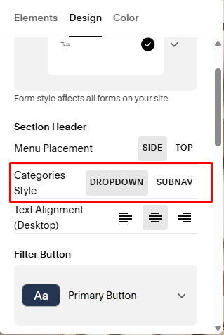 On mobile, categories always appear inside the filter drawer, regardless of chosen style.