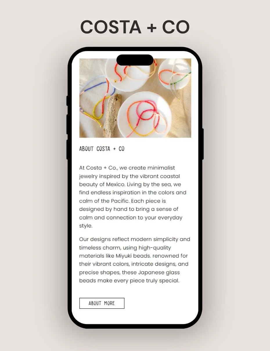 Costa + Co. is a premium jewelry brand showcasing handcrafted minimalist pieces inspired by the Mexican coast. Built by Squareko, this Squarespace jewelry website captures calm luxury, coastal warmth, and modern simplicity—creating a shopping experience that feels both personal and elevated. Each Costa + Co. piece is made with purpose—blending modern design with timeless craftsmanship. Using vibrant Miyuki beads and fine materials, the brand celebrates individuality and effortless beauty.