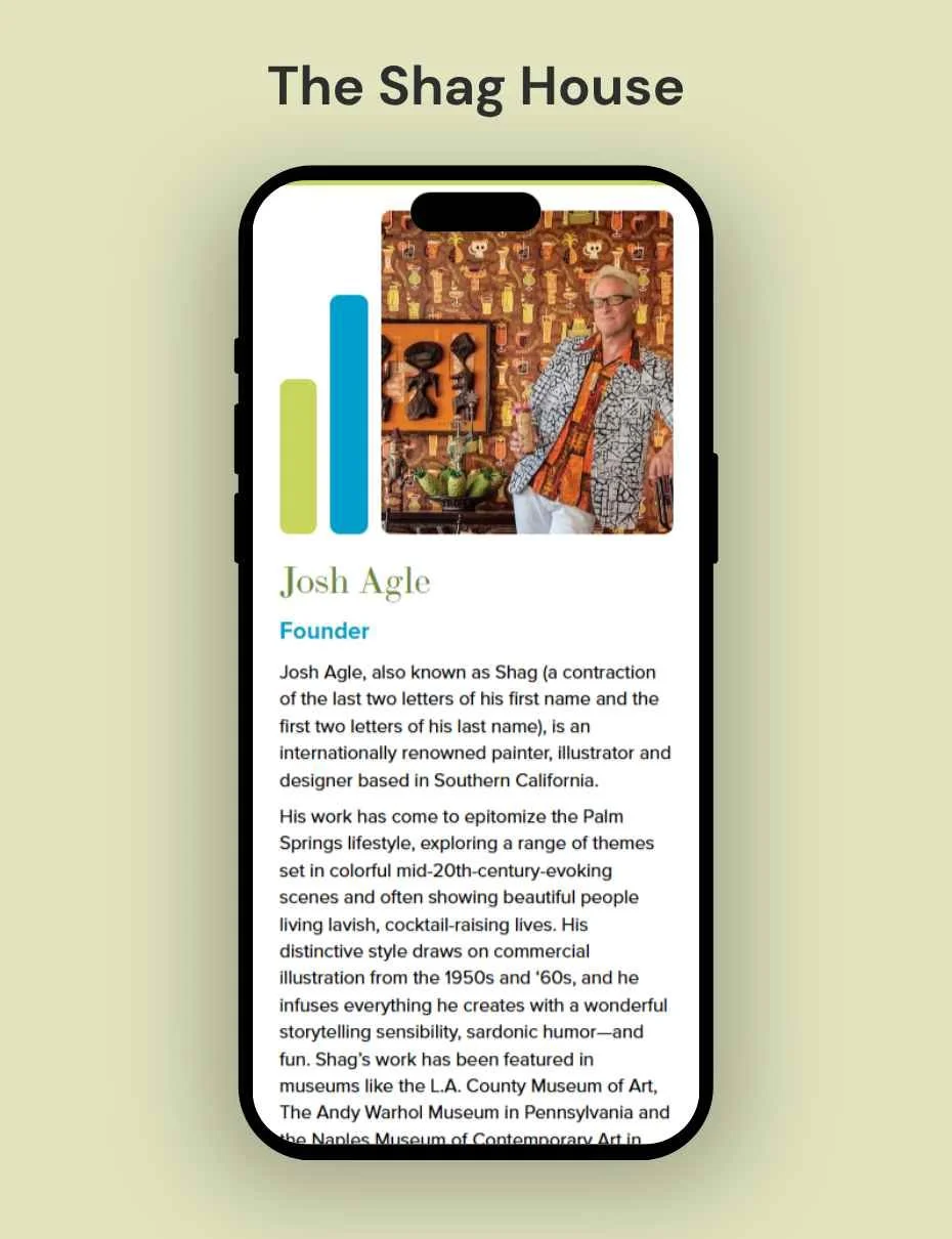 The Shag House website appeals to art lovers, design fans, collectors, and cultural travelers who admire the blend of Midcentury Modern architecture with Shag’s pop-art style. It shares the story of turning a historic Palm Springs home into a vibrant art space and community hub for charity, creativity, and events. The site highlights bold design, artistic vision, and a giving spirit, offering an immersive experience where art, lifestyle, and purpose connect.